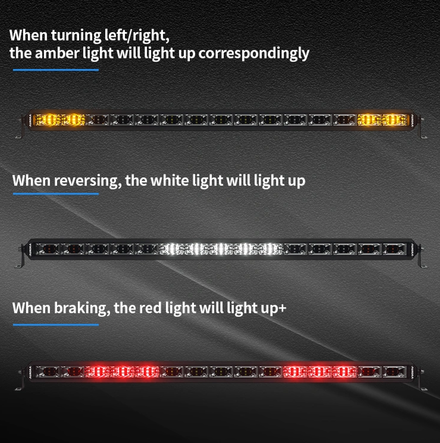 Intelligent 4-Mode Signal System: Integrated brake, reverse, and turn signals + running lights—coded by red, amber, and white LEDs to meet highway standard expectations (DOT/E‑mark compliant).
